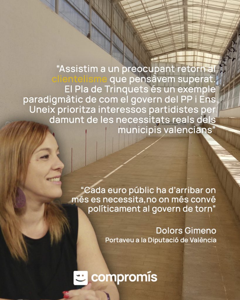 La moció, presentada per la portaveu de Compromís, Dolors Gimeno, respon a l’assignació del recent Pla de Trinquets, amb una inversió de 8 milions d’euros, que s’ha caracteritzat per l’assignació d’ajudes íntegrament “a dit”, sense criteris objectius ni concurrència competitiva, i beneficiant majoritàriament municipis governats pels mateixos partits que conformen el govern provincial.